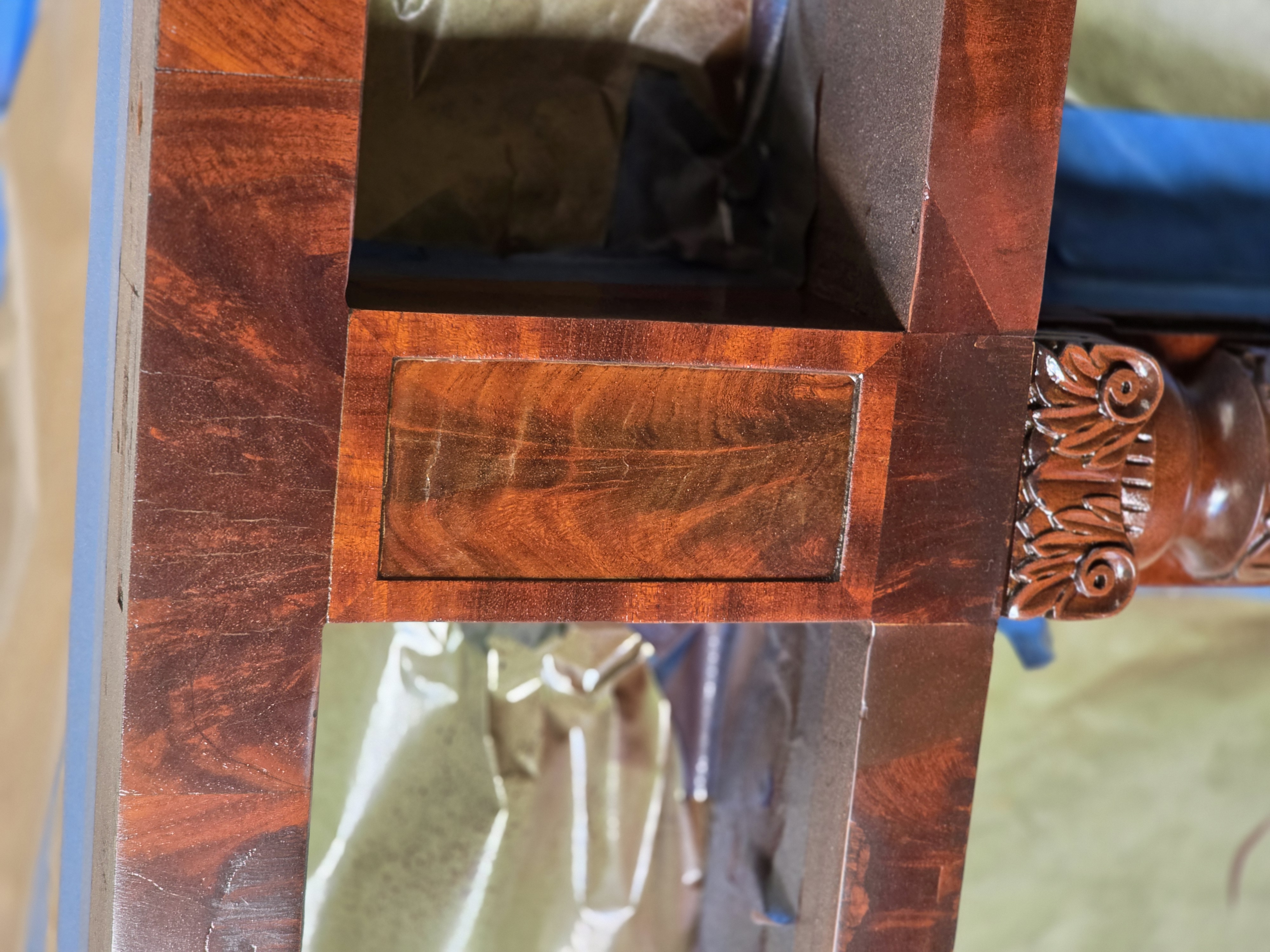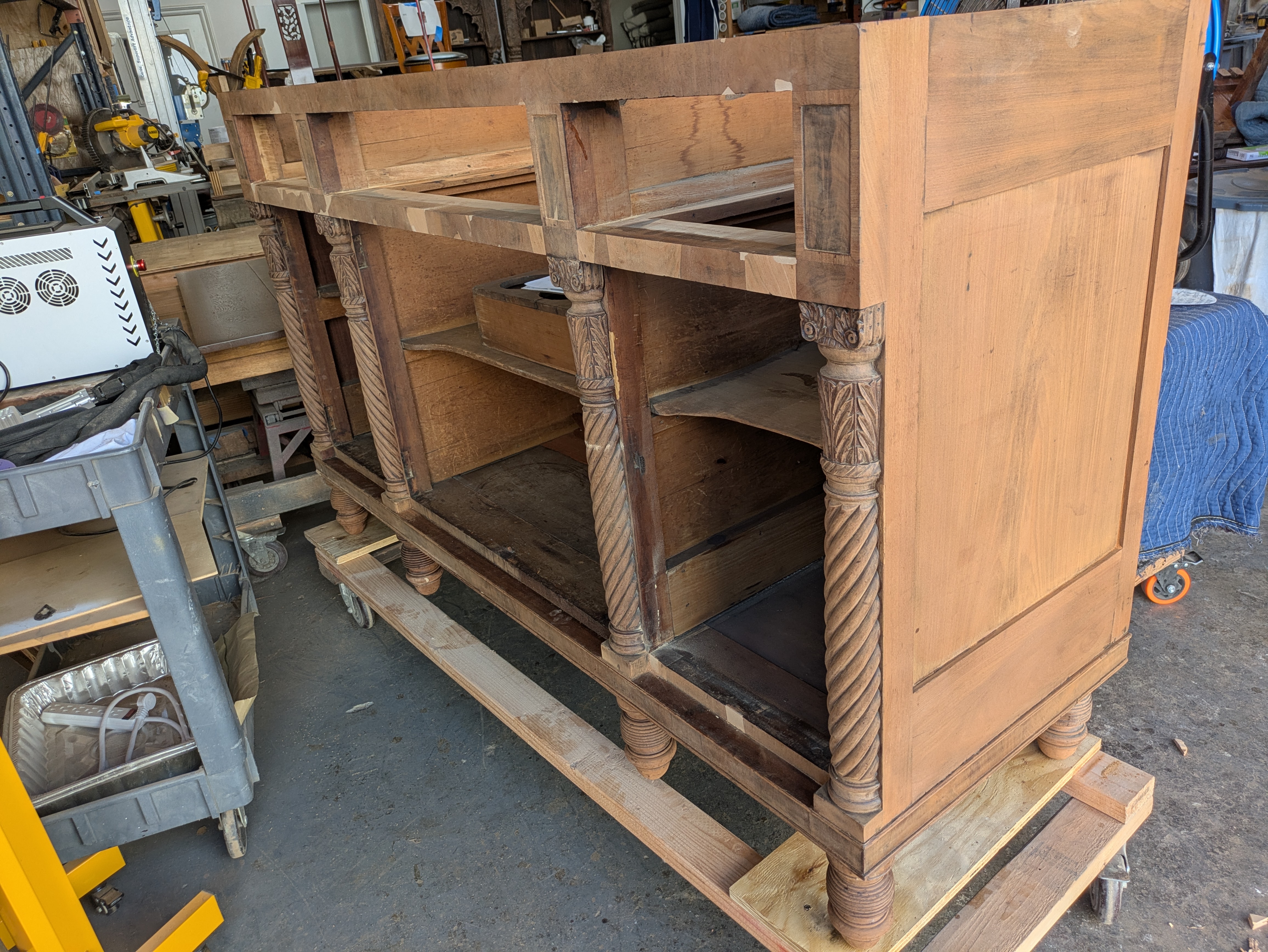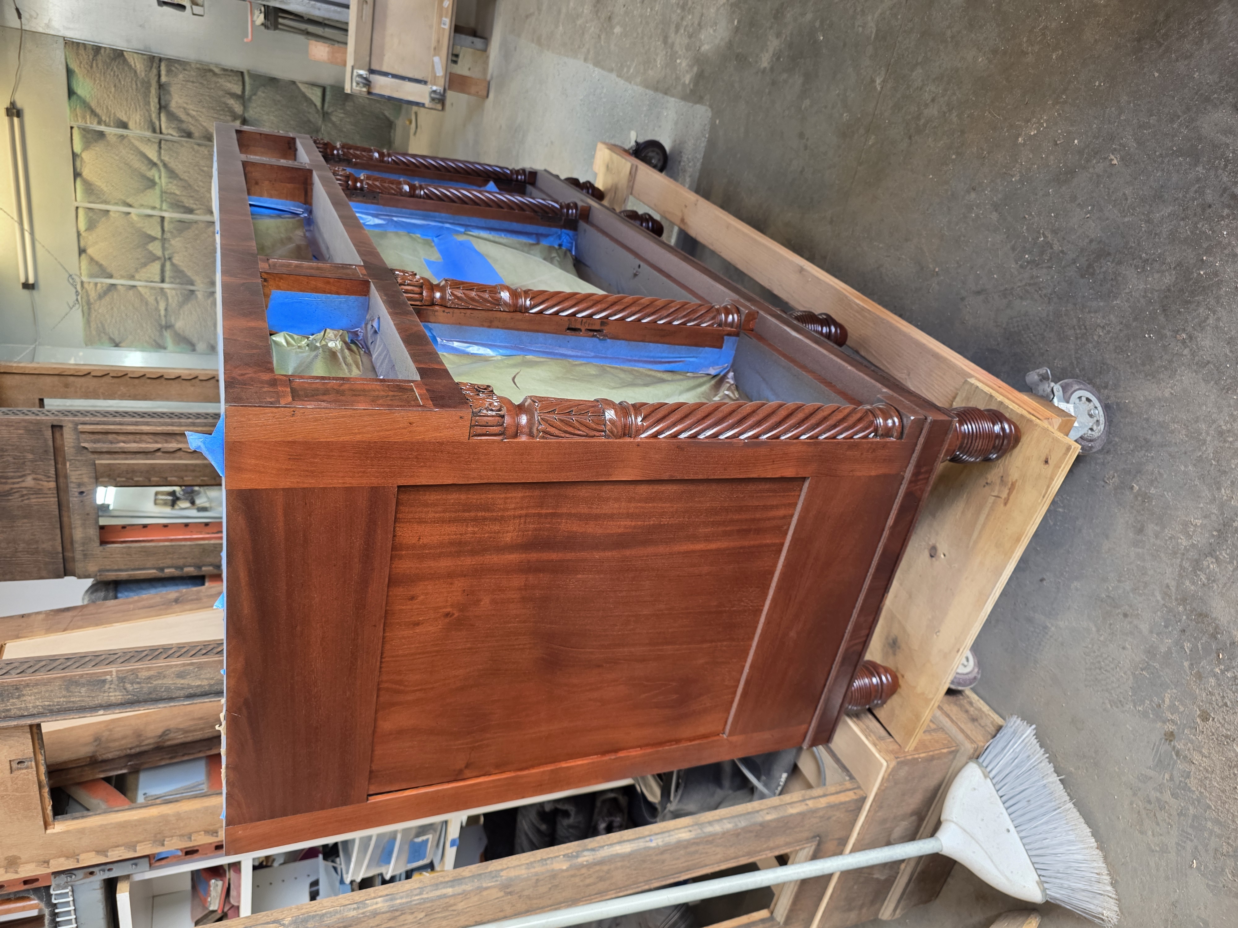 Antique buffet had a cracked top, damaged carving, and a foot had fallen off. Dan, his Family and staff repaired the damage, stripped off the old varnish, and refinished the piece. Custom knobs were turned and colored to match the piece, and color corrections were made to old repairs.