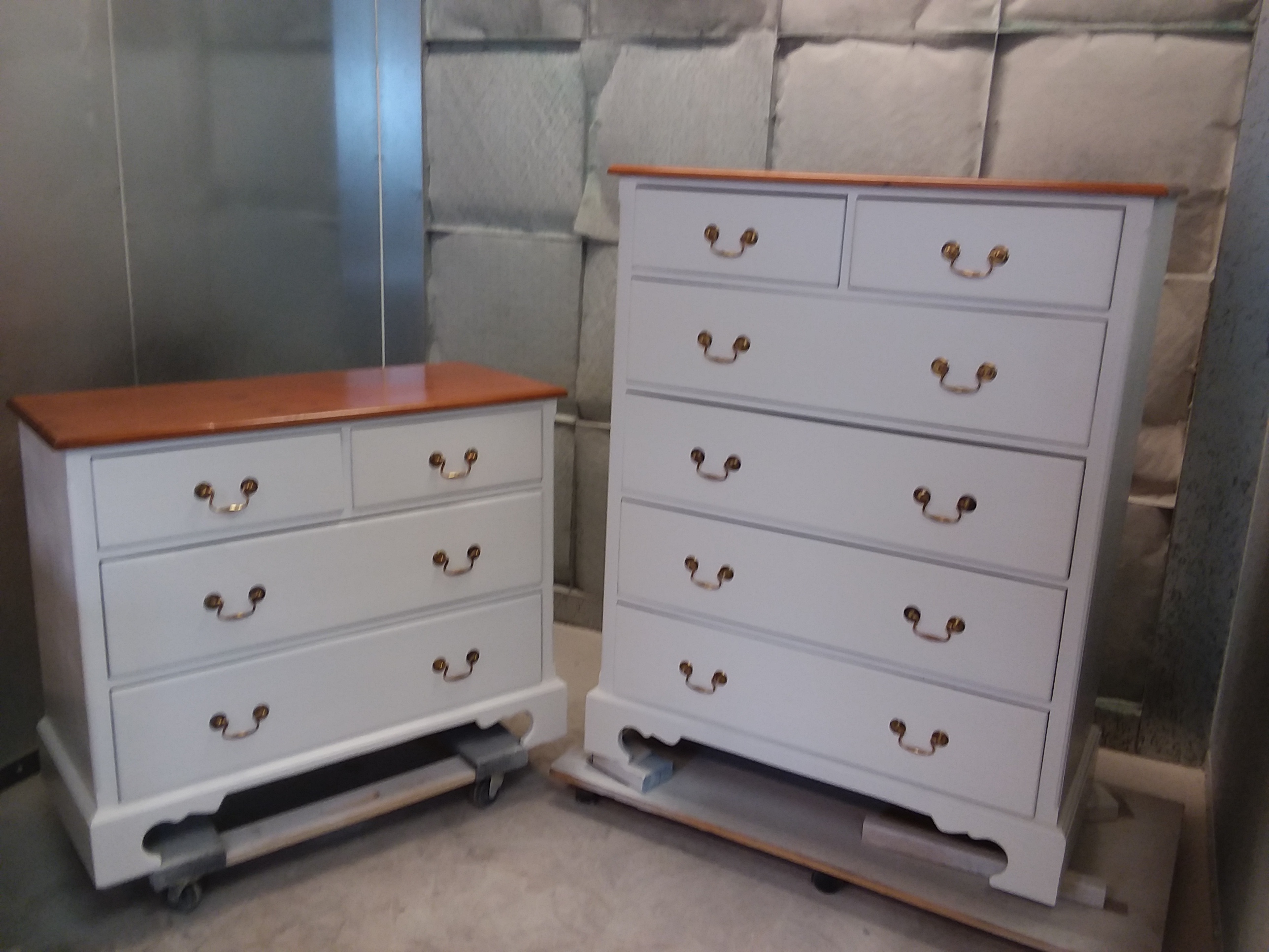 Pieces have a farm house look. Originally were waxed We stripped the wax, painted the body and finished the tops natural