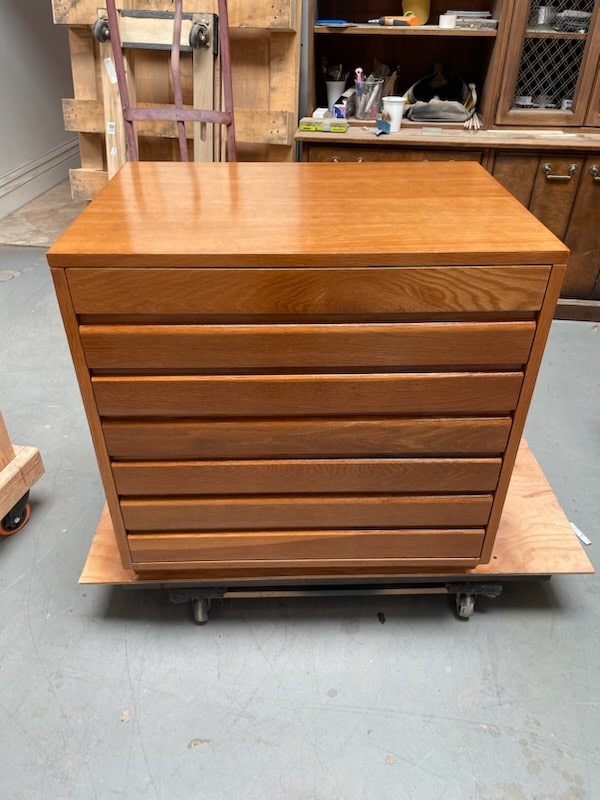 Dresser was left in the garage for years and suffered damage. Dan the Furniture Repair Man's team stripped off the old varnish, sanded the wood, repaired the damage then colored and varnished it back to a beautiful and useful piece of furniture.