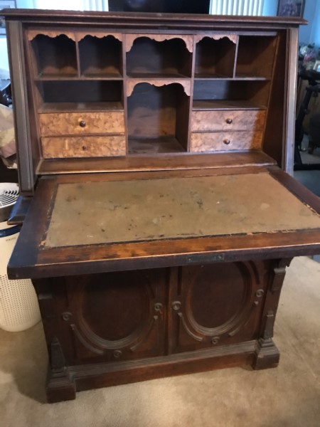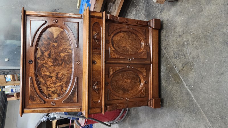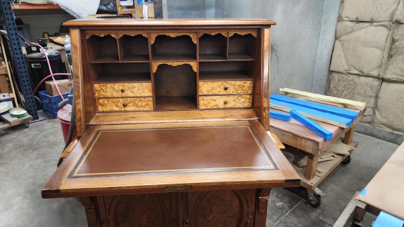 110 year old family heirloom restored by Dan and his team. They stripped and sanded the piece revealing the beautiful wood underneath, then they repaired pieces, installed a new gold leaf trim leather writing surface and varnished it to preserve the wood and bring out the beauty.